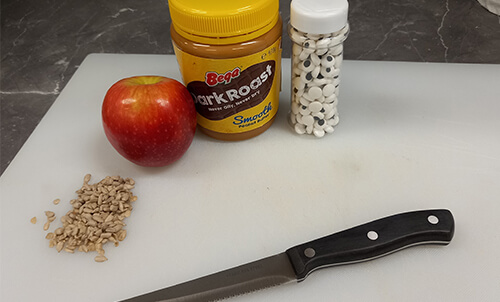 Using butter knife, spread a thin layer of nut butter into the “mouth”. It’s okay if it’s a little messy.
