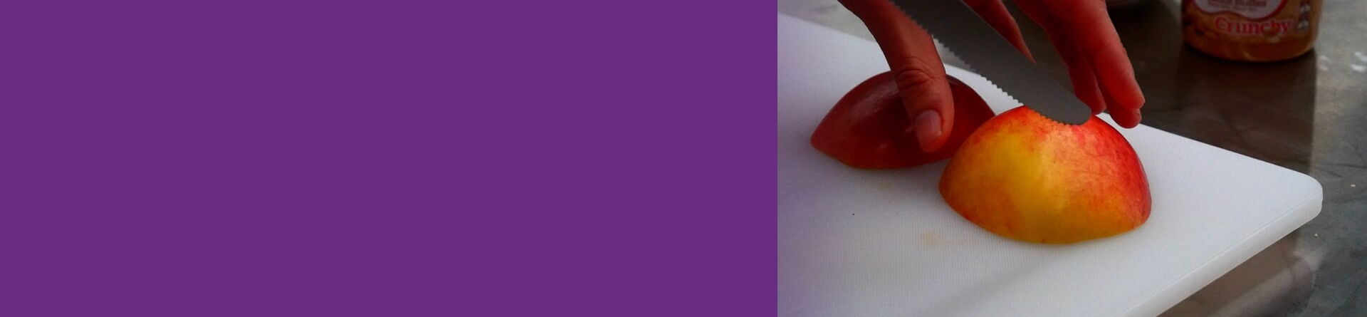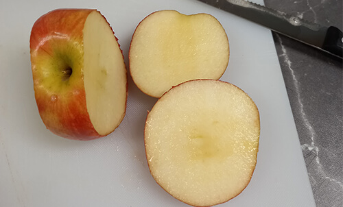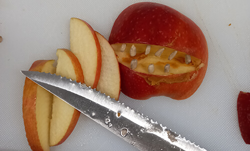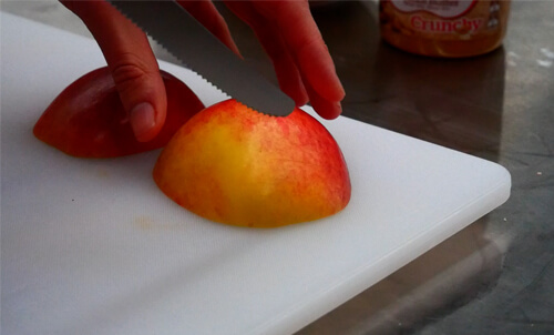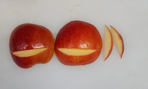 Using the sharp knife, slice two “cheeks” from the apple, avoiding the core in the middle.