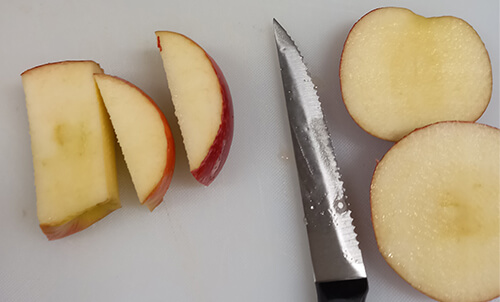 Using the sharp knife, slice the small pieces of apple lengthways into thin slices.