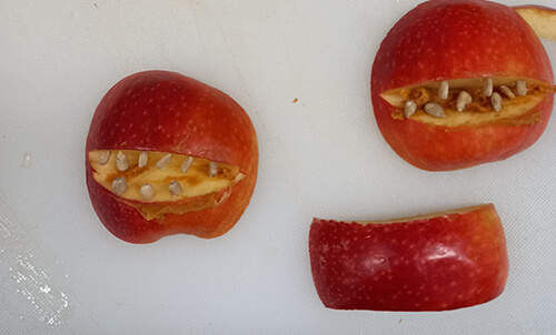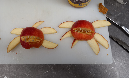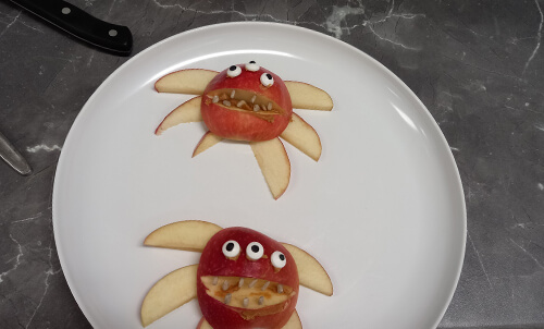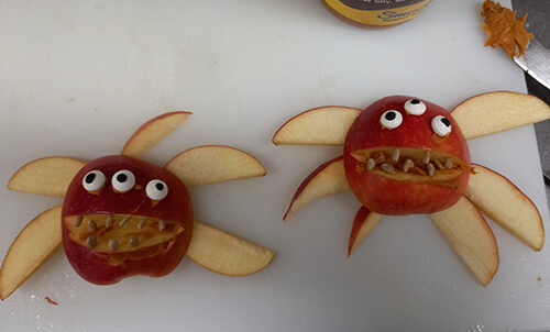 Using a little dot of nut butter as glue, place as many google eyes as you want onto your new apple monsters.