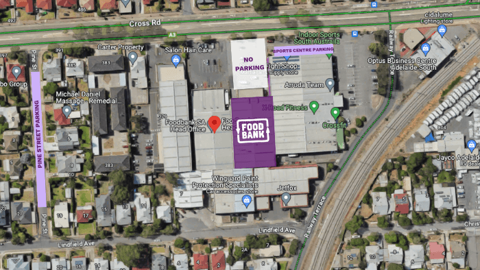 PARKING: Parking is available as highlighted in purple in front of the Cricket Centre/Synergy Fight Shop and on the west side of Pine Street. Please report to the Foodbank SA & NT Reception upon arrival.